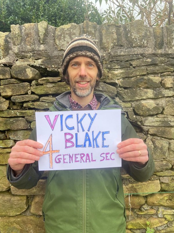 I am proud to support Vicky Blake and strongly believe she is the best candidate standing for General Secretary. Vicky has an excellent record of listening to and engaging with members and activists and I believe will build on this to strengthen our union. Vicky has tabled motions to increase transparency in decision making within our national committees. Importantly she has a platform of overhauling our information management systems to support organising, this is key at a local and regional level to get the vote out and effectively communicate with our members. Finally, I think it’s of key importance as a union to model employment practices that we fight for every day in our sectors, something I know Vicky also believes strongly in and will work tirelessly to repair relationships with our staff union.